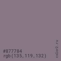 Цвет #877784 в цветовой модели RGB обозначается тремя октетами (135, 119, 132) в десятичном формате и #877784 в шестнадцатиричном (hex) формате, которые являются интенсивностью красного 135 (hex 87), интенсивность зелёного 119 (hex 77) и интенсивность синего 132 (hex 84).