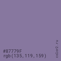 Цвет #87779F в цветовой модели RGB обозначается тремя октетами (135, 119, 159) в десятичном формате и #87779F в шестнадцатиричном (hex) формате, которые являются интенсивностью красного 135 (hex 87), интенсивность зелёного 119 (hex 77) и интенсивность синего 159 (hex 9F).