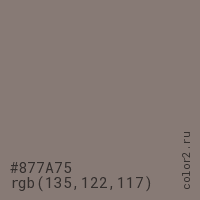 Цвет #877A75 в цветовой модели RGB обозначается тремя октетами (135, 122, 117) в десятичном формате и #877A75 в шестнадцатиричном (hex) формате, которые являются интенсивностью красного 135 (hex 87), интенсивность зелёного 122 (hex 7A) и интенсивность синего 117 (hex 75).