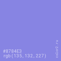 Цвет #8784E3 в цветовой модели RGB обозначается тремя октетами (135, 132, 227) в десятичном формате и #8784E3 в шестнадцатиричном (hex) формате, которые являются интенсивностью красного 135 (hex 87), интенсивность зелёного 132 (hex 84) и интенсивность синего 227 (hex E3).