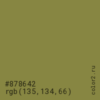 Цвет #878642 в цветовой модели RGB обозначается тремя октетами (135, 134, 66) в десятичном формате и #878642 в шестнадцатиричном (hex) формате, которые являются интенсивностью красного 135 (hex 87), интенсивность зелёного 134 (hex 86) и интенсивность синего 66 (hex 42).