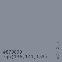 Цвет #878C99 в цветовой модели RGB обозначается тремя октетами (135, 140, 153) в десятичном формате и #878C99 в шестнадцатиричном (hex) формате, которые являются интенсивностью красного 135 (hex 87), интенсивность зелёного 140 (hex 8C) и интенсивность синего 153 (hex 99).