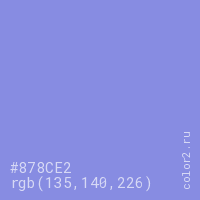 Цвет #878CE2 в цветовой модели RGB обозначается тремя октетами (135, 140, 226) в десятичном формате и #878CE2 в шестнадцатиричном (hex) формате, которые являются интенсивностью красного 135 (hex 87), интенсивность зелёного 140 (hex 8C) и интенсивность синего 226 (hex E2).