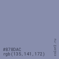 Цвет #878DAC в цветовой модели RGB обозначается тремя октетами (135, 141, 172) в десятичном формате и #878DAC в шестнадцатиричном (hex) формате, которые являются интенсивностью красного 135 (hex 87), интенсивность зелёного 141 (hex 8D) и интенсивность синего 172 (hex AC).