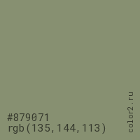 Цвет #879071 в цветовой модели RGB обозначается тремя октетами (135, 144, 113) в десятичном формате и #879071 в шестнадцатиричном (hex) формате, которые являются интенсивностью красного 135 (hex 87), интенсивность зелёного 144 (hex 90) и интенсивность синего 113 (hex 71).