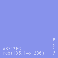 Цвет #8792EC в цветовой модели RGB обозначается тремя октетами (135, 146, 236) в десятичном формате и #8792EC в шестнадцатиричном (hex) формате, которые являются интенсивностью красного 135 (hex 87), интенсивность зелёного 146 (hex 92) и интенсивность синего 236 (hex EC).