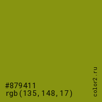 Цвет #879411 в цветовой модели RGB обозначается тремя октетами (135, 148, 17) в десятичном формате и #879411 в шестнадцатиричном (hex) формате, которые являются интенсивностью красного 135 (hex 87), интенсивность зелёного 148 (hex 94) и интенсивность синего 17 (hex 11).