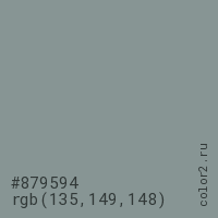 Цвет #879594 в цветовой модели RGB обозначается тремя октетами (135, 149, 148) в десятичном формате и #879594 в шестнадцатиричном (hex) формате, которые являются интенсивностью красного 135 (hex 87), интенсивность зелёного 149 (hex 95) и интенсивность синего 148 (hex 94).