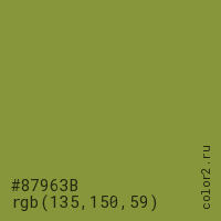 Цвет #87963B в цветовой модели RGB обозначается тремя октетами (135, 150, 59) в десятичном формате и #87963B в шестнадцатиричном (hex) формате, которые являются интенсивностью красного 135 (hex 87), интенсивность зелёного 150 (hex 96) и интенсивность синего 59 (hex 3B).
