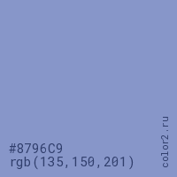 Цвет #8796C9 в цветовой модели RGB обозначается тремя октетами (135, 150, 201) в десятичном формате и #8796C9 в шестнадцатиричном (hex) формате, которые являются интенсивностью красного 135 (hex 87), интенсивность зелёного 150 (hex 96) и интенсивность синего 201 (hex C9).
