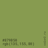 Цвет #879B50 в цветовой модели RGB обозначается тремя октетами (135, 155, 80) в десятичном формате и #879B50 в шестнадцатиричном (hex) формате, которые являются интенсивностью красного 135 (hex 87), интенсивность зелёного 155 (hex 9B) и интенсивность синего 80 (hex 50).