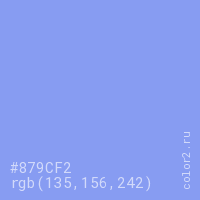 Цвет #879CF2 в цветовой модели RGB обозначается тремя октетами (135, 156, 242) в десятичном формате и #879CF2 в шестнадцатиричном (hex) формате, которые являются интенсивностью красного 135 (hex 87), интенсивность зелёного 156 (hex 9C) и интенсивность синего 242 (hex F2).