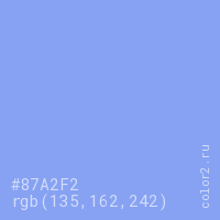 Цвет #87A2F2 в цветовой модели RGB обозначается тремя октетами (135, 162, 242) в десятичном формате и #87A2F2 в шестнадцатиричном (hex) формате, которые являются интенсивностью красного 135 (hex 87), интенсивность зелёного 162 (hex A2) и интенсивность синего 242 (hex F2).