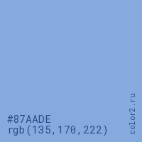 Цвет #87AADE в цветовой модели RGB обозначается тремя октетами (135, 170, 222) в десятичном формате и #87AADE в шестнадцатиричном (hex) формате, которые являются интенсивностью красного 135 (hex 87), интенсивность зелёного 170 (hex AA) и интенсивность синего 222 (hex DE).