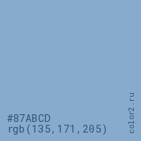 Цвет #87ABCD в цветовой модели RGB обозначается тремя октетами (135, 171, 205) в десятичном формате и #87ABCD в шестнадцатиричном (hex) формате, которые являются интенсивностью красного 135 (hex 87), интенсивность зелёного 171 (hex AB) и интенсивность синего 205 (hex CD).