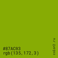 Цвет #87AC03 в цветовой модели RGB обозначается тремя октетами (135, 172, 3) в десятичном формате и #87AC03 в шестнадцатиричном (hex) формате, которые являются интенсивностью красного 135 (hex 87), интенсивность зелёного 172 (hex AC) и интенсивность синего 3 (hex 03).