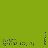 Цвет #87AC11 в цветовой модели RGB обозначается тремя октетами (135, 172, 17) в десятичном формате и #87AC11 в шестнадцатиричном (hex) формате, которые являются интенсивностью красного 135 (hex 87), интенсивность зелёного 172 (hex AC) и интенсивность синего 17 (hex 11).