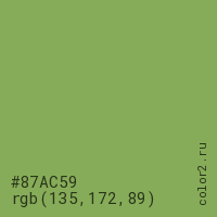 Цвет #87AC59 в цветовой модели RGB обозначается тремя октетами (135, 172, 89) в десятичном формате и #87AC59 в шестнадцатиричном (hex) формате, которые являются интенсивностью красного 135 (hex 87), интенсивность зелёного 172 (hex AC) и интенсивность синего 89 (hex 59).