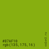 Цвет #87AF10 в цветовой модели RGB обозначается тремя октетами (135, 175, 16) в десятичном формате и #87AF10 в шестнадцатиричном (hex) формате, которые являются интенсивностью красного 135 (hex 87), интенсивность зелёного 175 (hex AF) и интенсивность синего 16 (hex 10).