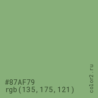 Цвет #87AF79 в цветовой модели RGB обозначается тремя октетами (135, 175, 121) в десятичном формате и #87AF79 в шестнадцатиричном (hex) формате, которые являются интенсивностью красного 135 (hex 87), интенсивность зелёного 175 (hex AF) и интенсивность синего 121 (hex 79).