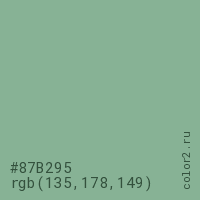 Цвет #87B295 в цветовой модели RGB обозначается тремя октетами (135, 178, 149) в десятичном формате и #87B295 в шестнадцатиричном (hex) формате, которые являются интенсивностью красного 135 (hex 87), интенсивность зелёного 178 (hex B2) и интенсивность синего 149 (hex 95).