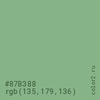 Цвет #87B388 в цветовой модели RGB обозначается тремя октетами (135, 179, 136) в десятичном формате и #87B388 в шестнадцатиричном (hex) формате, которые являются интенсивностью красного 135 (hex 87), интенсивность зелёного 179 (hex B3) и интенсивность синего 136 (hex 88).