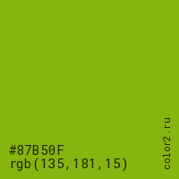Цвет #87B50F в цветовой модели RGB обозначается тремя октетами (135, 181, 15) в десятичном формате и #87B50F в шестнадцатиричном (hex) формате, которые являются интенсивностью красного 135 (hex 87), интенсивность зелёного 181 (hex B5) и интенсивность синего 15 (hex 0F).
