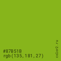 Цвет #87B51B в цветовой модели RGB обозначается тремя октетами (135, 181, 27) в десятичном формате и #87B51B в шестнадцатиричном (hex) формате, которые являются интенсивностью красного 135 (hex 87), интенсивность зелёного 181 (hex B5) и интенсивность синего 27 (hex 1B).