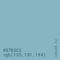Цвет #87B5C2 в цветовой модели RGB обозначается тремя октетами (135, 181, 194) в десятичном формате и #87B5C2 в шестнадцатиричном (hex) формате, которые являются интенсивностью красного 135 (hex 87), интенсивность зелёного 181 (hex B5) и интенсивность синего 194 (hex C2).