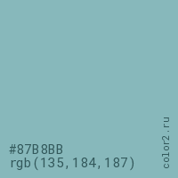 Цвет #87B8BB в цветовой модели RGB обозначается тремя октетами (135, 184, 187) в десятичном формате и #87B8BB в шестнадцатиричном (hex) формате, которые являются интенсивностью красного 135 (hex 87), интенсивность зелёного 184 (hex B8) и интенсивность синего 187 (hex BB).