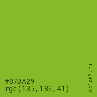 Цвет #87BA29 в цветовой модели RGB обозначается тремя октетами (135, 186, 41) в десятичном формате и #87BA29 в шестнадцатиричном (hex) формате, которые являются интенсивностью красного 135 (hex 87), интенсивность зелёного 186 (hex BA) и интенсивность синего 41 (hex 29).