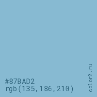 Цвет #87BAD2 в цветовой модели RGB обозначается тремя октетами (135, 186, 210) в десятичном формате и #87BAD2 в шестнадцатиричном (hex) формате, которые являются интенсивностью красного 135 (hex 87), интенсивность зелёного 186 (hex BA) и интенсивность синего 210 (hex D2).