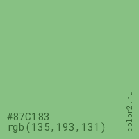 Цвет #87C183 в цветовой модели RGB обозначается тремя октетами (135, 193, 131) в десятичном формате и #87C183 в шестнадцатиричном (hex) формате, которые являются интенсивностью красного 135 (hex 87), интенсивность зелёного 193 (hex C1) и интенсивность синего 131 (hex 83).