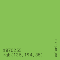 Цвет #87C255 в цветовой модели RGB обозначается тремя октетами (135, 194, 85) в десятичном формате и #87C255 в шестнадцатиричном (hex) формате, которые являются интенсивностью красного 135 (hex 87), интенсивность зелёного 194 (hex C2) и интенсивность синего 85 (hex 55).
