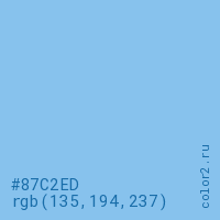 Цвет #87C2ED в цветовой модели RGB обозначается тремя октетами (135, 194, 237) в десятичном формате и #87C2ED в шестнадцатиричном (hex) формате, которые являются интенсивностью красного 135 (hex 87), интенсивность зелёного 194 (hex C2) и интенсивность синего 237 (hex ED).