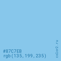 Цвет #87C7EB в цветовой модели RGB обозначается тремя октетами (135, 199, 235) в десятичном формате и #87C7EB в шестнадцатиричном (hex) формате, которые являются интенсивностью красного 135 (hex 87), интенсивность зелёного 199 (hex C7) и интенсивность синего 235 (hex EB).