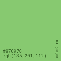 Цвет #87C970 в цветовой модели RGB обозначается тремя октетами (135, 201, 112) в десятичном формате и #87C970 в шестнадцатиричном (hex) формате, которые являются интенсивностью красного 135 (hex 87), интенсивность зелёного 201 (hex C9) и интенсивность синего 112 (hex 70).