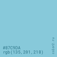 Цвет #87C9DA в цветовой модели RGB обозначается тремя октетами (135, 201, 218) в десятичном формате и #87C9DA в шестнадцатиричном (hex) формате, которые являются интенсивностью красного 135 (hex 87), интенсивность зелёного 201 (hex C9) и интенсивность синего 218 (hex DA).