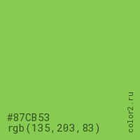 Цвет #87CB53 в цветовой модели RGB обозначается тремя октетами (135, 203, 83) в десятичном формате и #87CB53 в шестнадцатиричном (hex) формате, которые являются интенсивностью красного 135 (hex 87), интенсивность зелёного 203 (hex CB) и интенсивность синего 83 (hex 53).