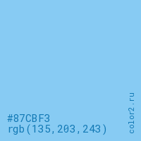 Цвет #87CBF3 в цветовой модели RGB обозначается тремя октетами (135, 203, 243) в десятичном формате и #87CBF3 в шестнадцатиричном (hex) формате, которые являются интенсивностью красного 135 (hex 87), интенсивность зелёного 203 (hex CB) и интенсивность синего 243 (hex F3).