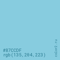 Цвет #87CCDF в цветовой модели RGB обозначается тремя октетами (135, 204, 223) в десятичном формате и #87CCDF в шестнадцатиричном (hex) формате, которые являются интенсивностью красного 135 (hex 87), интенсивность зелёного 204 (hex CC) и интенсивность синего 223 (hex DF).