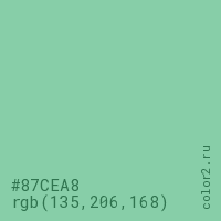 Цвет #87CEA8 в цветовой модели RGB обозначается тремя октетами (135, 206, 168) в десятичном формате и #87CEA8 в шестнадцатиричном (hex) формате, которые являются интенсивностью красного 135 (hex 87), интенсивность зелёного 206 (hex CE) и интенсивность синего 168 (hex A8).