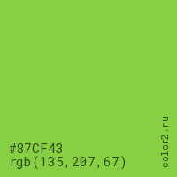Цвет #87CF43 в цветовой модели RGB обозначается тремя октетами (135, 207, 67) в десятичном формате и #87CF43 в шестнадцатиричном (hex) формате, которые являются интенсивностью красного 135 (hex 87), интенсивность зелёного 207 (hex CF) и интенсивность синего 67 (hex 43).