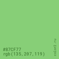 Цвет #87CF77 в цветовой модели RGB обозначается тремя октетами (135, 207, 119) в десятичном формате и #87CF77 в шестнадцатиричном (hex) формате, которые являются интенсивностью красного 135 (hex 87), интенсивность зелёного 207 (hex CF) и интенсивность синего 119 (hex 77).