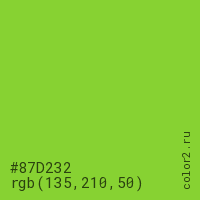 Цвет #87D232 в цветовой модели RGB обозначается тремя октетами (135, 210, 50) в десятичном формате и #87D232 в шестнадцатиричном (hex) формате, которые являются интенсивностью красного 135 (hex 87), интенсивность зелёного 210 (hex D2) и интенсивность синего 50 (hex 32).