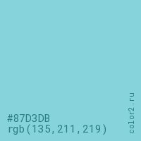 Цвет #87D3DB в цветовой модели RGB обозначается тремя октетами (135, 211, 219) в десятичном формате и #87D3DB в шестнадцатиричном (hex) формате, которые являются интенсивностью красного 135 (hex 87), интенсивность зелёного 211 (hex D3) и интенсивность синего 219 (hex DB).