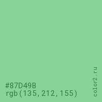 Цвет #87D49B в цветовой модели RGB обозначается тремя октетами (135, 212, 155) в десятичном формате и #87D49B в шестнадцатиричном (hex) формате, которые являются интенсивностью красного 135 (hex 87), интенсивность зелёного 212 (hex D4) и интенсивность синего 155 (hex 9B).