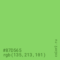 Цвет #87D565 в цветовой модели RGB обозначается тремя октетами (135, 213, 101) в десятичном формате и #87D565 в шестнадцатиричном (hex) формате, которые являются интенсивностью красного 135 (hex 87), интенсивность зелёного 213 (hex D5) и интенсивность синего 101 (hex 65).