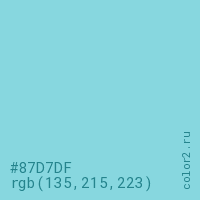 Цвет #87D7DF в цветовой модели RGB обозначается тремя октетами (135, 215, 223) в десятичном формате и #87D7DF в шестнадцатиричном (hex) формате, которые являются интенсивностью красного 135 (hex 87), интенсивность зелёного 215 (hex D7) и интенсивность синего 223 (hex DF).