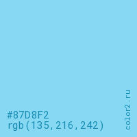 Цвет #87D8F2 в цветовой модели RGB обозначается тремя октетами (135, 216, 242) в десятичном формате и #87D8F2 в шестнадцатиричном (hex) формате, которые являются интенсивностью красного 135 (hex 87), интенсивность зелёного 216 (hex D8) и интенсивность синего 242 (hex F2).